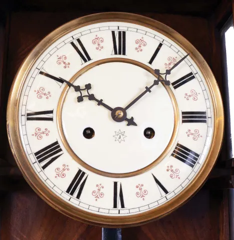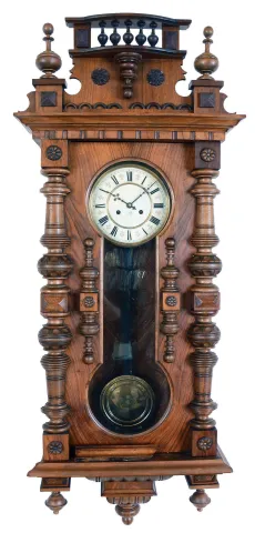 Clocks- 2 (Two) Vienna regulators, Germany, 8 days: (1) Junghans, Wurttemberg, time and strike, spring driven movement in a carved Alt Deutsch walnut case with barbell shaped glazed window in door, turned elements and pressed brass pendulum The dial is a