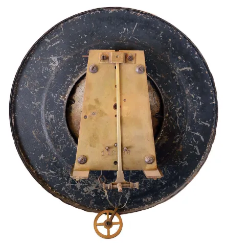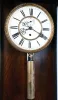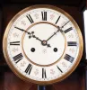 Clocks- 2 (Two) Vienna regulators, Germany, 8 days: (1) Junghans, Wurttemberg, time and strike, spring driven movement in a carved Alt Deutsch walnut case with barbell shaped glazed window in door, turned elements and pressed brass pendulum The dial is a cream enamel two part with Roman numerals. (2) Germany, time only, brass weight driven movement in a walnut case with two part white enamel dial and second's bit (1) the case retains most of its original finish and the top finial is absent and the lower finials are replacements. The lower left return is detached but present. There is a split through the middle of the crest. The dial is excellent. 21in x 51in 8.5in (2) The case retains its original finish and the crest is a replacement. The three lower finials are absent and the weight is a replacement. 18in x 46in x 7in.