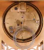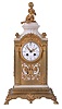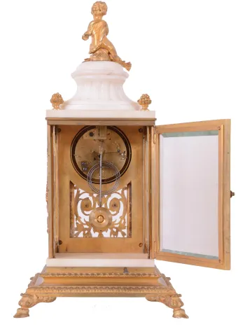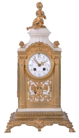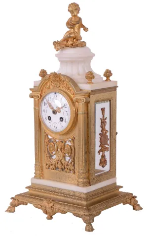 Vincenti & Cie, Paris, France for Black, Starr, New York, fancy crystal regulator mantel clock, 8 days, time and gong strike, spring driven movement in a marble case with beveled glass sides, ormolu trim and base with a pedastal top surmounted by a putto and flanked by clusters of grapes finials. The white enamel Arabic numeral dial has festoons of polychrome painted lowers. the case is in good condition with no damage to marble, some remanant of original gilding and spotting to areas of the brass. The movement ticks and strikes, but has not been fully tested. The dial is in very good condition with little loss and only a tiny hairline near mounting screw.