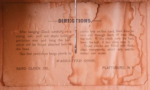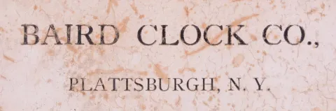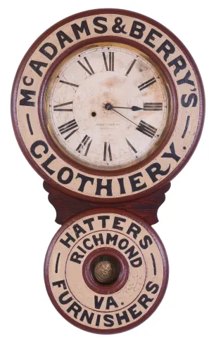 Baird Clock Co., Plattsburgh, New York, "McAdams & Berry's Clothiery", 8 day, spring brass movement advertising wall timepiece.