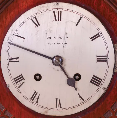 English bracket clock (John Perry, Nottingham) with a German spring driven fusee movement with a ting tang quarter hour strike in a mahogany case. The mahogany case retains a nice original finish. The silvered dial shows some wear and age darkening. The hands appear to be original.