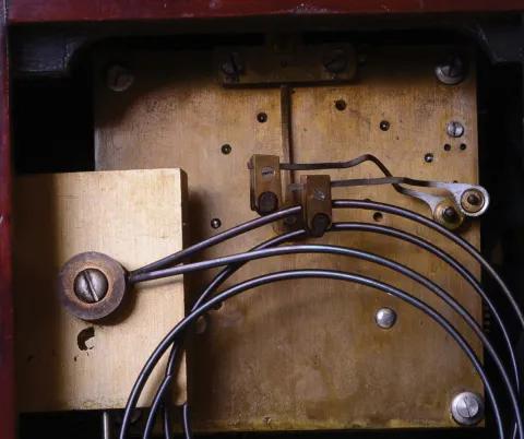 The mahogany case retains a nice original finish. The silvered dial shows some wear and age darkening. The hands appear to be original.