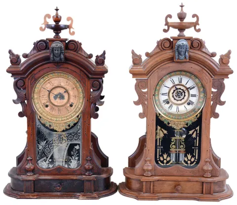 Clocks- 2 (Two) Ansonia Clock Co., New York, NY, "Monarch" walnut 8 day time and strike mantel clocks, one with alarm, c1880 the darker example appears to have its original finish with some scratches. There are a few small holes on the sides where something (incorrect) may have been attached at one time. The top urn ornament handles are new and unstained. It retains its rear paper label, along with a St. Louis retailer label, but its paper dial is quite worn. The tablet is original but worn. The lighter color one (with alarm) has been refinished and its front carved side ornaments were missing, so the back ones have been moved to the front. Its original paper dial is good, but its glass is new and inappropriate. Both tick and strike but were not tested long term. Pendulums and hands correct on both.