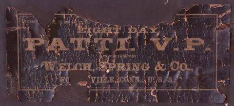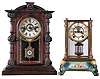 Clocks- 2 (Two): (1) Ansonia Clock Co., New York, NY, "Crystal Regulator No. 6", 8 day, time and strike spring brass movement crystal regulator mantel clock. c1906 (2) Welch, Spring & Co., Forestville, Conn., "Patti V.P.", 8 day, time and strike spring brass movement mantel clock. c1880 (1) Porcelain base and gilded brass case, but sadly has its porcelain top missing. Some of the gilding remains on the applied corner ornaments. Original porcelain dial is perfect. Hands are replacements. Original pendulum. Left side beveled glass panel has a corner chip. The other glass panels look fine. Brass door knobs are missing. Ht 12.5" (2) Rosewood and rosewood veneered case in original finish has veneer damage on the top back edge and small chip on the top left side molding. Original painted dial has scattered paint loss. Minute hand is a replacement. Hour hand is original. Period pendulum. The top finials are missing. Original tablet. Remains of a label on the back of the case. Ht 16.5"