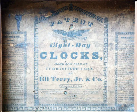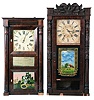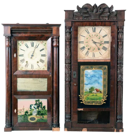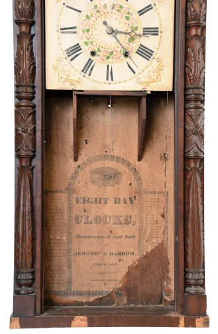 Clocks- 2 (Two): (1) Jeromes & Darrow, Bristol, Conn., 8 day, time and strike weight wood movement carved column & splat shelf clock. c1830 (2) Eli Terry Jr & Co., Terrysville, Conn., 8 day, time and strike weight wood movement column & cornice shelf clock. c1836 (1) Mahogany veneered case in original finish with veneer loss on the base. Original wood dial is soiled with minor loss. Bottom tablet is missing. Center tablet is not original. Fairly clean label inside the case. Original movement. Ht 40.25" (2) Mahogany veneered case in old and possibly original finish with veneer loss on the base. Original painted dial is very clean with minor wear. Bottom tablet is period and maybe original, but is now held in the door with wood strips. Hands are period, but the hour hand does not fit the hour pipe. There are several verges included that will need to be adapted to fit the movement. Clean label inside the case. There are no weights for this clock. Ht 34.25"