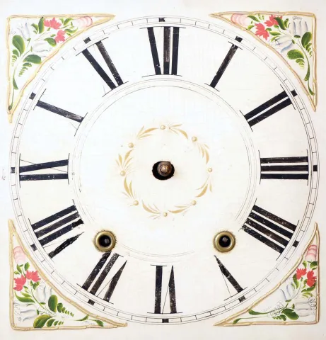 (1) Mahogany veneered case in original finish with veneer loss on the base. Original wood dial is soiled with minor loss. Bottom tablet is missing. Center tablet is not original. Fairly clean label inside the case. Original movement. Ht 40.25" (2) Mahogany veneered case in old and possibly original finish with veneer loss on the base. Original painted dial is very clean with minor wear. Bottom tablet is period and maybe original, but is now held in the door with wood strips. Hands are period, but the hour hand does not fit the hour pipe. There are several verges included that will need to be adapted to fit the movement. Clean label inside the case. There are no weights for this clock. Ht 34.25"