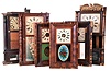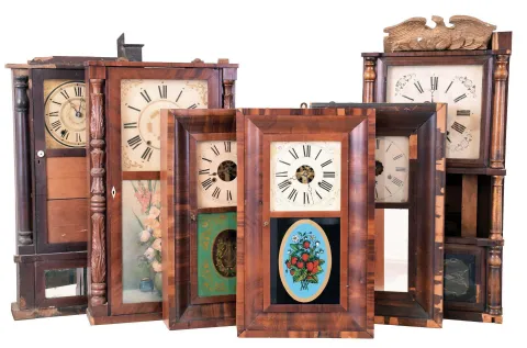 (1) Mahogany case rough with mirror panel top needing restoration. Original wood dial and hands. (2) Mahogany case with veneer replacement on base. Original wood dial, hands, movement, pendulum, label. (3) Mahogany case with serious veneer loss on rounded moldings. Repainted dial and tablet. Replaced mirror and hands, good label & pendulum. (4) Mahogany case with minor veneer loss on base. Repainted wood dial, darkened label, Original movement, hands. Replaced tablet. (5) Movement is Riley Whiting type 1.73, not original to case. Proper wood dial. Splat and chimneys in bottom of case. Original pendulum, label and pair of reproduction hands. Tablet not original. (6) Mahogany case with veneer loss. Original lower tablet, missing center glass. Original dial, hands and movement. Reproduction feet and dust caps included. Plaster gilt eagle splat in case and some miscellaneous loose parts in case. Four sets of 30 hour weights and one set of 8 day weights included.