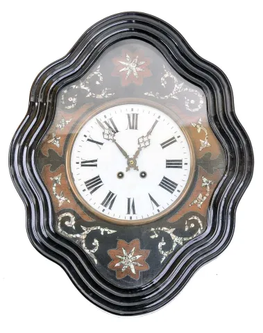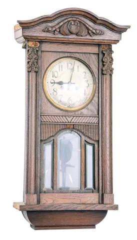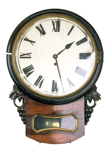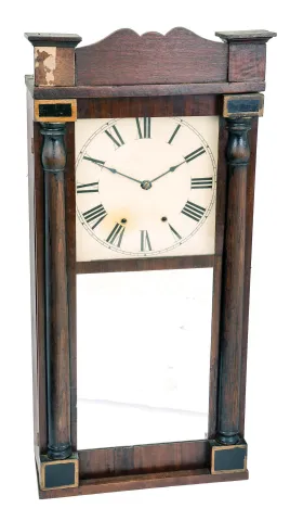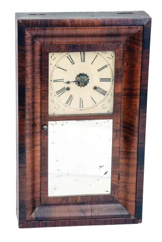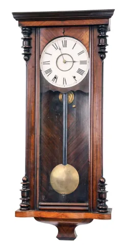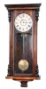 Clocks- 7 (Seven) antique: English walnut single-fusee 8 day wall; French Morbier bakery 8 day time and strike wall, glass dial; German "Exact" 8 day time and strike box wall regulator; Connecticut Vienna-regulator style 8 day time and strike wall;