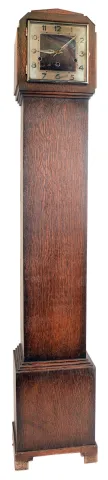 Clocks- 7 (Seven) antique: English walnut single-fusee 8 day wall; French Morbier bakery 8 day time and strike wall, glass dial; German "Exact" 8 day time and strike box wall regulator; Connecticut Vienna-regulator style 8 day time and strike wall; Gilbert 30 hour time and strike weight-driven OG shelf; Connecticut 8 day time and strike weight-driven column and splat shelf clock; German oak Westminster chime 8 day grandmother clock; late 19th and early 20th centuries most are in fair to good original condition with some losses, but sold as is with no further details available. Best is the French bakery clock. Ht of tallest is 55".