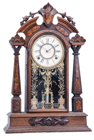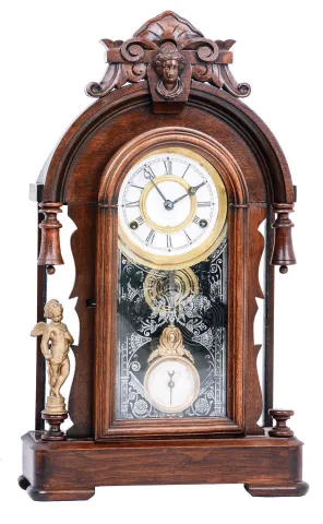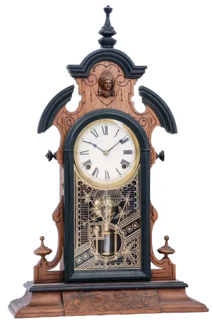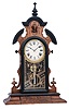 Clocks- 3 (Three): (1) F. Kroeber, New York, "Japanese" shelf clock with an 8 days spring driven brass time and strike movement in a walnut case. c1875. (2) George B. Owen, Winsted, Conn., "Panel" model shelf clock with an 8 day spring driven brass time