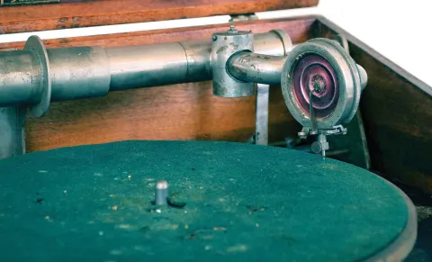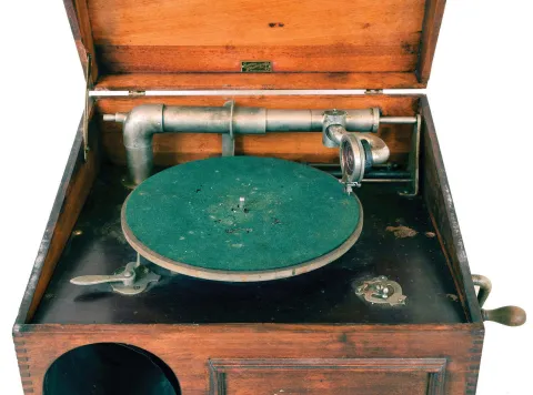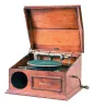 Sonora table phonograph. Very little information and no photos could be found on this unusual phonograph Its case looks like a music box and from what we can find, it appears this is a very rare early model phonograph made by the Swiss music box firm of E