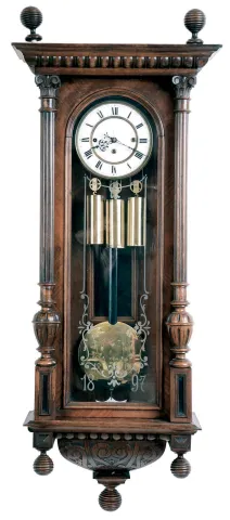 German "Remember" 3 Weight Grand Sonnerie 8 day Walnut Vienna Regulator Wall Clock, movement #200,000-39677. the highly ornate case has been nicely rubbed, and is complete except for no top, just top finials. The front glass is old but has its painted pattern and date on the exterior, so not original. The white enamel dial has some hairlines. The signed movement appears complete but was not tested.