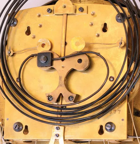 the highly ornate case has been nicely rubbed, and is complete except for no top, just top finials. The front glass is old but has its painted pattern and date on the exterior, so not original. The white enamel dial has some hairlines. The signed movement appears complete but was not tested.