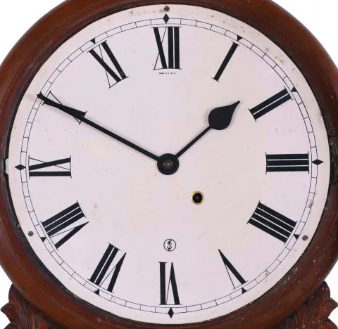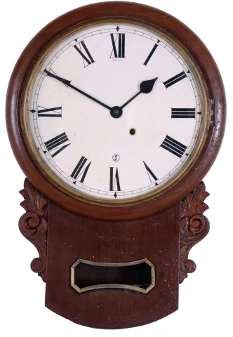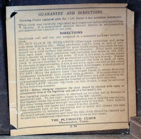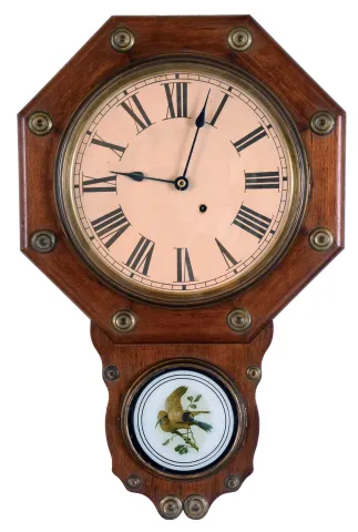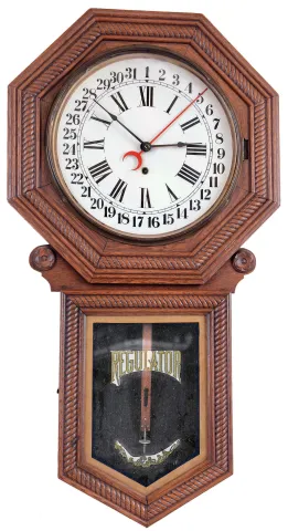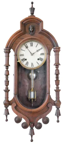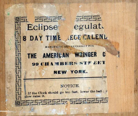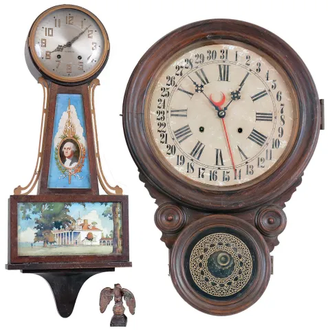 Clocks- 6 (Six) Wall Hanging, 8 days: (1) Plymouth, Thomaston, Conn., time and strike banjo, c1935; (1) American Clock Company, New York, (attribution) Victorian wall clock with E.N. Welch time and strike movement in walnut case, c1875; (3) Unsigned (probably Ansonia) figure "8" time, strike and calendar in grained case, c1900; (4) E. Ingraham Co. for the American Wringer Co., New York "Eclipse" time, strike and calendar oak, c1910; (5) Seth Thomas Clock Co., Thomaston, Conn., "Office No. 2" wall hanging clock with a spring driven 8 days timepiece movement in a walnut case. c1875; (6) Anglo American wall hanging clock with a spring driven 8 days timepiece movement by the Seth Thomas Clock Co. c1880. (1) the Plymouth top plinth and eagle finial are detached but present. (2) The oak "Eclipse" top glass is out of the bezel, it needs a pendulum bob, and its finish and dial are new. (3) The figure "8" appears complete, with old surface, although the dial may be an old paper replacement. (4) The Welch has been fully restored with new finish and paper dial. (5) The case has some original finish and is in nice condition. The paper dial is a replacement. The hands are correct. The bottom door glass is original. (6) The mahogany case is in nice condition with some white paint dots. The dial is a paper replacement. The hands are correct. The movement is signed. The bottom glass has been broken and needs to be replaced. Hts 29 in, 24 in, 33 in, 34.5, 26.5in and 22in..