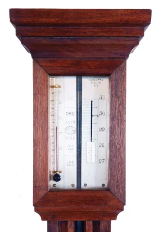 Hemingway Auburn, NY mercury stick barometer with thermometer in mahogany case with silvered scales.