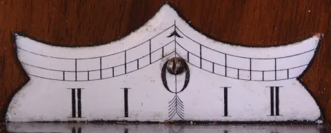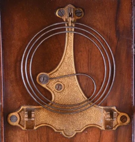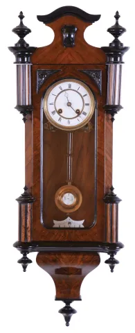 European walnut and ebonized case has been nicely refinished. There are some very small dings in the veneer on the bottom of the door and a small imperfection on the edge of the top right finial base. Porcelain dial is perfect. Original hands and finials. R/A pendulum is fine.