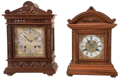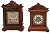 Clocks- 2 (Two) German Bracket "RMS" (Mueller & Co.) walnut 8 day time and strike, beveled glasses, silvered chapter rings on ornate brass dials, both with bim-bam quarter-hour striking; early 20th century the smaller case has been refinished; the larger darker one appears to have an old finish; both are in very good condition. The silvered chapter rings show some tarnish. The thick beveled glasses all are fine. The trademarked movements were not tested and are sold as is. Hts 15.5 and 14.5 in