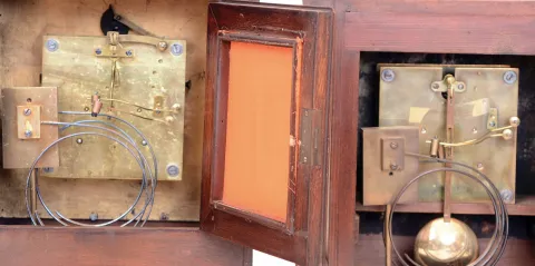 the smaller case has been refinished; the larger darker one appears to have an old finish; both are in very good condition. The silvered chapter rings show some tarnish. The thick beveled glasses all are fine. The trademarked movements were not tested and are sold as is. Hts 15.5 and 14.5 in