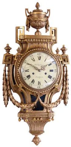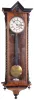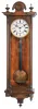 Clocks- 3 (Three) Wall European 8 day: two time only Vienna regulators, one with movement maker stamp "AG"(?) , c1900; Rob. Engstrom, Stockholm, Swedish gilt wood striking cartel; c1950 all three have original surfaces and are in good overall condition. One Vienna has a broken-off lower finial. The white enamel dials are good, but one is missing its seconds bit. The beat scale on one is chipped. The Swedish clock gold finish is very good with very minor losses; the lower glass is detached. Its movement's pallet arbor is out of position and will need attention. There are no weights, and one Vienna pendulum is dented. Hts 44 in, 43 in and 32 in
