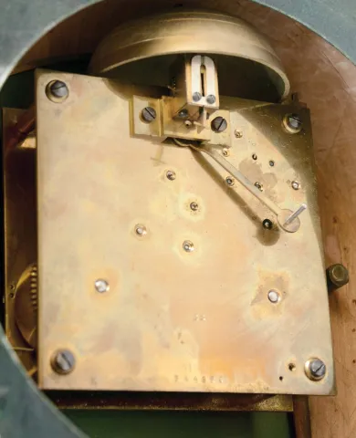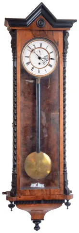 all three have original surfaces and are in good overall condition. One Vienna has a broken-off lower finial. The white enamel dials are good, but one is missing its seconds bit. The beat scale on one is chipped. The Swedish clock gold finish is very good with very minor losses; the lower glass is detached. Its movement's pallet arbor is out of position and will need attention. There are no weights, and one Vienna pendulum is dented. Hts 44 in, 43 in and 32 in
