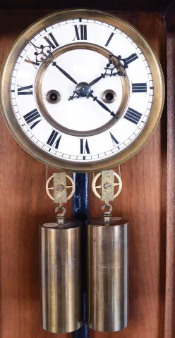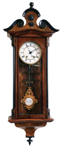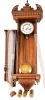 (1) complete, and has a glossy finish, with some minor repairs, and the dial has been restored around the winding holes. (2) case is missing its lower bracket and the wood has been refinished. Its painted metal dial has strengthened black numbers. (3) ornate brass shows some wear and some very minor dings, otherwise the condition is very good. (4) as shown, has broken apart and needs professional woodworking to restore. Its unsigned movements appears complete. None tested, sold as is with no further details available. Vienna overall Ht 50 in. (5) case has been refinished and the movement is not ticking nor striking, Ht 31in