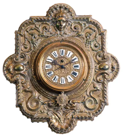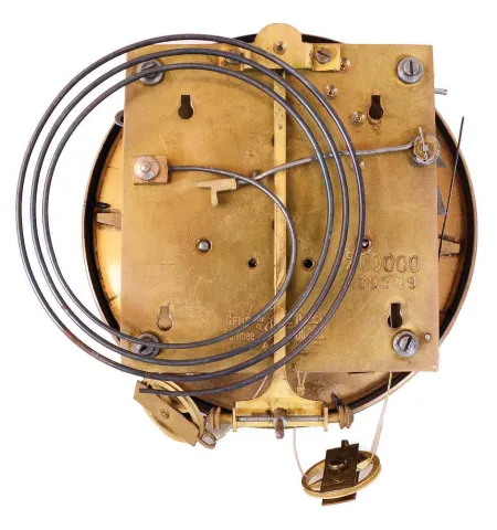 Clocks- 5 (Five) wall, 8 day: (1) Lenzkirch walnut time and strike spring wound R/A; (2) Seth Thomas Clock Co., "Office No. 5" oak time only gallery clock, c1904; (3) French pressed brass time only hanging clock, cartouche numbers, tic-tac pendulum; (4) German Vienna Regulator 3 weight quarter striking wall clock (in pieces) , c1890; (5) Remember, Germany two weight miniature Vienna regulator in a walnut case (1) complete, and has a glossy finish, with some minor repairs, and the dial has been restored around the winding holes. (2) case is missing its lower bracket and the wood has been refinished. Its painted metal dial has strengthened black numbers. (3) ornate brass shows some wear and some very minor dings, otherwise the condition is very good. (4) as shown, has broken apart and needs professional woodworking to restore. Its unsigned movements appears complete. None tested, sold as is with no further details available. Vienna overall Ht 50 in. (5) case has been refinished and the movement is not ticking nor striking, Ht 31in
