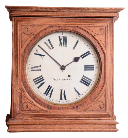 Clocks- 5 (Five) wall, 8 day: (1) Lenzkirch walnut time and strike spring wound R/A; (2) Seth Thomas Clock Co., "Office No. 5" oak time only gallery clock, c1904; (3) French pressed brass time only hanging clock, cartouche numbers, tic-tac pendulum; (4)
