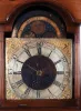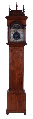 the case is a beautiful walnut Pennsylvania style case, which has been refinished with some minor age splits and repairs to return moldings. The movement is not original to the case and has been exposed to fire and the arch and moon disc have been charred. One weight is a modern replacement. The pendulum is period. John Benson is a well renowned English clockmaker and his work can be seen in the main hall of 10 Downing Street residence and office of the Prime Minister.