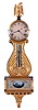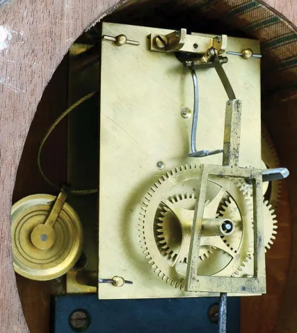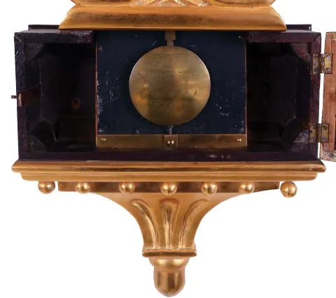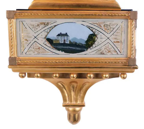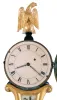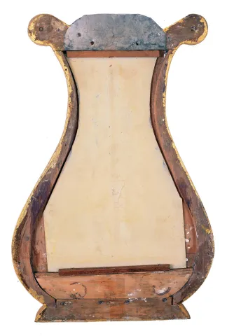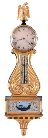 Lyre banjo, wall clock, 8 days, time only, weight driven Willard type period movement with T-bridge suspension in a reproduction gold fronted case with some older elements and reverse painted throat and lower tablets. The painted metal dial has Roman