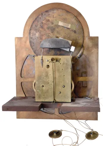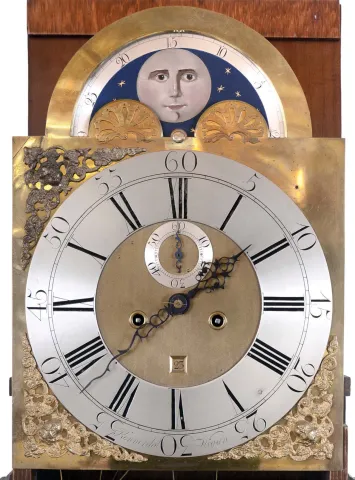 the case has been refinished and totally restored including pendulum, finials, rosettes, feet, etc. The door hinges are Victorian additions. The dial has been restored by Kathy Edwards of the Dial House including repainting of the moon phase. The weights are old brass clad replacements. The upper right spandrel is absent.