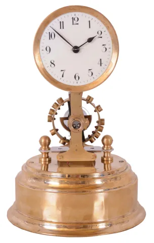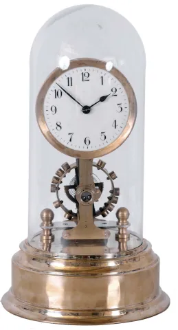 German Eureka, battery powered, electro-magnetic timepiece mounted on brass base under dome with large exposed rotating balance.