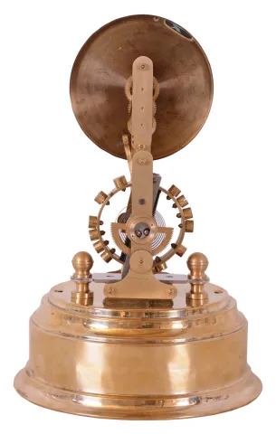 German Eureka, battery powered, electro-magnetic timepiece mounted on brass base under dome with large exposed rotating balance. This timepiece has been nicely restored to working condition as evidenced by the letter included describing the repair work performed. The dome is not original as this current dome is 5.75" in diameter. The dome should be about 6 3/8" in diameter to sit on the next level down from the top of the base. For reference please see the thorough examination of these German eureka's detailed on pages of 38 - 44 of F.G. Alan Shenton's "The eureka Clock".