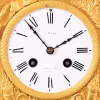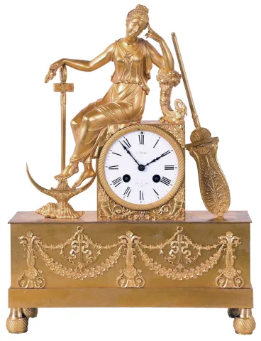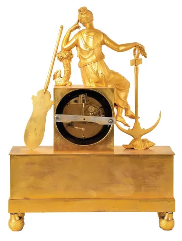 France, mantel clock, gilt bronze case with oblong base with engine turned feet, the front with applied floral swags and anchors, surmounted by a female figure in a contemplative pose, and resting her arms on an anchor and cornucopia, Roman numeral white enamel dial with partial signature, blued steel hands, 8 day time and strike pendule a Paris movement gilding bright, a bit dirty, feet bent and with replaced screws, minor specks of verdigris, dial with chip at 7:00, filled chip at center arbor, hands replaced, rear ring for mounting movement missing, replaced with a steel strip, movement and dial replaced, ticks and strikes