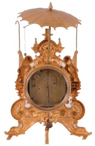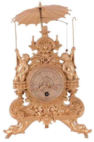 Novelty clock, possibly German, gilt brass case with Baroque ornament, thirty hour timepiece movement with two trains run from a single barrel, one for the flying ball pendulum, alternately caught and released by the two staff wielding putti beneath a parasol, the second train with recoil escapement and pendulum controlling the timekeeping very good overall, flying pendulum arbor bent, clock will not retain tension on the mainspring until this is remedied, time train will tick with pressure on wheels