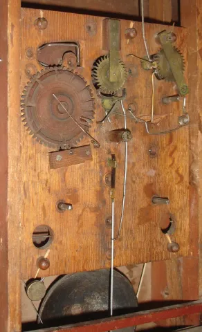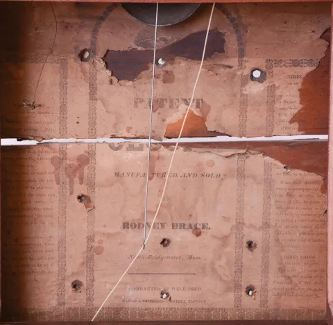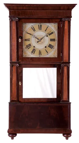 Rodney Brace, North Bridgewater, Mass., shelf clock with a weight driven Terry-style 30 hour time and strike and alarm wooden works movement in a triple decker pilaster and cornice top mahogany veneered case. The large mahogany veneered case with maple accents on the flat pilasters in very nice condition in an old and possibly original finish. The feet show little wear but they are the same type as found on other Brace cases. The upper door glass is original. The lower door mirror is a later replacement. The original painted dial is in good condition with some age darkening and some horizontal losses. The hands are original.