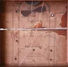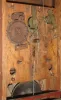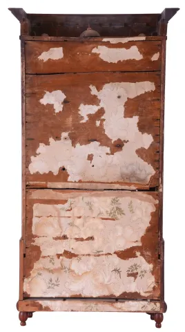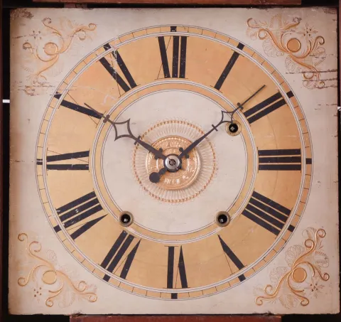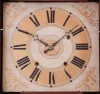 The large mahogany veneered case with maple accents on the flat pilasters in very nice condition in an old and possibly original finish. The feet show little wear but they are the same type as found on other Brace cases. The upper door glass is original. The lower door mirror is a later replacement. The original painted dial is in good condition with some age darkening and some horizontal losses. The hands are original.