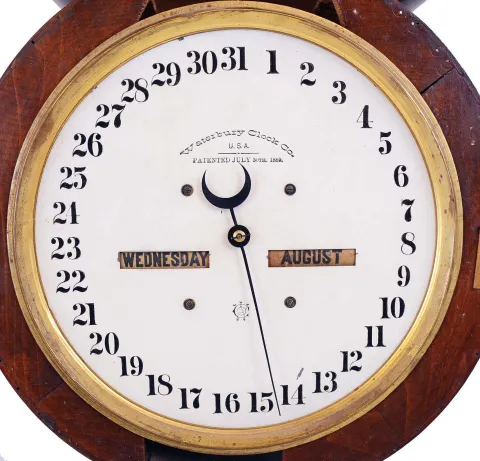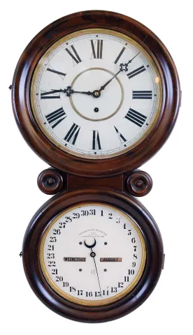 Waterbury Clock Co., Waterbury, Conn., "Calendar No. 34", 8 day, double dial calendar wall timepiece.