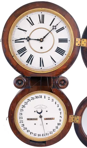 Waterbury Clock Co., Waterbury, Conn., "Calendar No. 34", 8 day, double dial calendar wall timepiece. Rosewood veneered case with some faux graining on turned areas of the door, with an old finish with some minor scratches on the doors. Original painted time dial with some very light marks in the white of the dial from someone rubbing the minute hand against the dial surface when changing the time. Original painted calendar dial with a tiny flake. Original hands. Calendar rollers have age darkened. Nice label on the back of the case.
