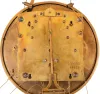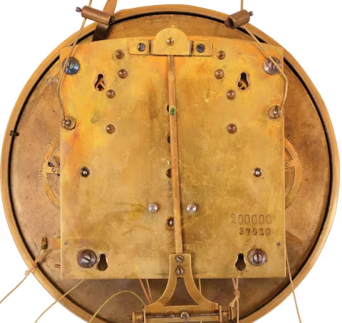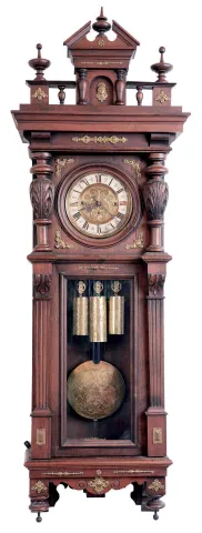 the large ornate case has been nicely restored and refinished, and the several applied pressed-brass accents are shiny. The matching brass pendulum and dial also are glossy, but the silvered parts of the dial are worn and tarnished. The case bottom has a split, and the bottom finial is absent. The signed movement appears complete but was not tested. One weight is larger and slightly different.