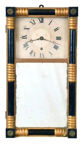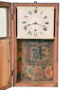 New Hampshire style mirror clock in small rustic case with later 8 day brass movement and painted wooden dial. the case has old period elements with a Japanese produce crate backboard. Sold "as is".