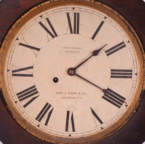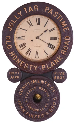 Edward P. Baird, Plattsburgh, New York, "Jolly Time Pastime", 8 day, spring brass movement advertising timepiece.