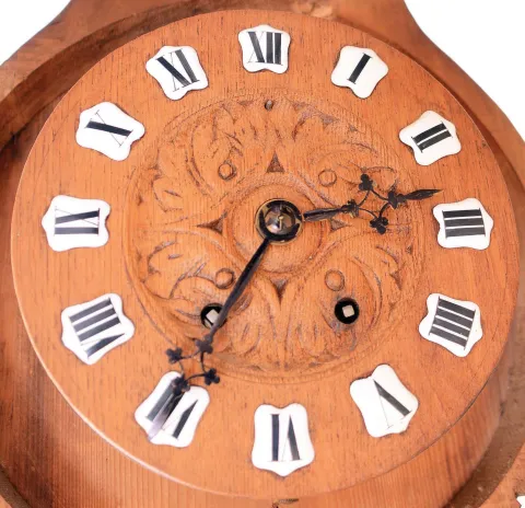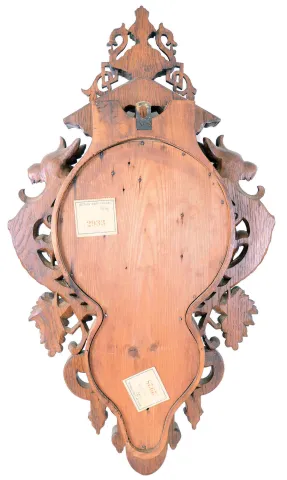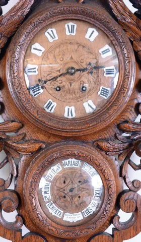 the clock appears in excellent original condition and the case has an old finish with no apparent breaks. The barometer hand is frozen. This impressively carved clock has a great Black Forest look and a high quality French movement.