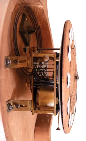 France, wall clock with barometer signed "Maison Wurtel E. Piefort Sucr a Paris", 8 days, time and strike, spring driven movement in an elaborately carved oak case featuring griffins, hanging fruit and surmounted by an urn with wooden dials on barometer and clock face with cartouche Roman numerals and barometric conditions. the clock appears in excellent original condition and the case has an old finish with no apparent breaks. The barometer hand is frozen. This impressively carved clock has a great Black Forest look and a high quality French movement.