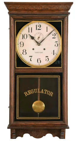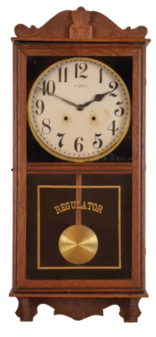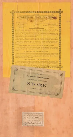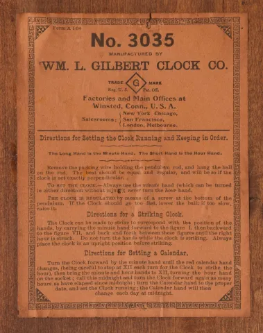 Clocks- 2 (Two) (1) Waterbury Clock Co., Waterbury, Conn., "Stork" wall hanging clock with a spring driven 30 day timepiece movement in an oak case. c1915. (2) William L. Gilbert Clock Co., Winsted, Conn., "No. 3035" wall hanging clock with a spring driven 8 day time and strike movement in an oak case. c1910. (1) The case retains its original, but somewhat alligatored, finish. The paper dial is in very good condition with some age marks on the left hand side. The hands are original. The movement is signed. Both door glasses appear original. Ht. 36in. (2) The case retains some original finish. The original paper dial is in very good condition. The hands are original. The movement is signed. Both door glasses appear original. Ht. 35.5in.