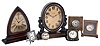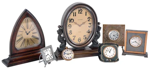 Clocks- 7 (Seven) Waltham 8 day time only: bronze library clock; mahogany library clock; two travel clocks, one in folding leather case; 3 metal-case desk clocks; early 20th century all are in good overall condition, but not tested and sold as is with no further details available. Bronze clock Ht is 12"