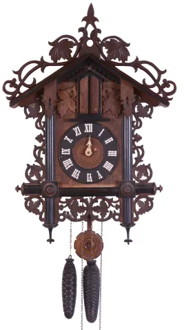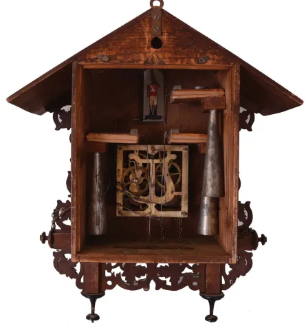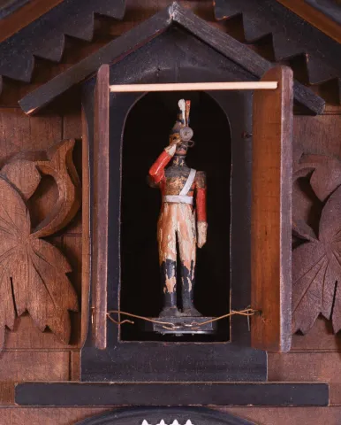 Germany Black Forest; 30 hours, time and strike weight brass movement three horn trumpeter wall clock.