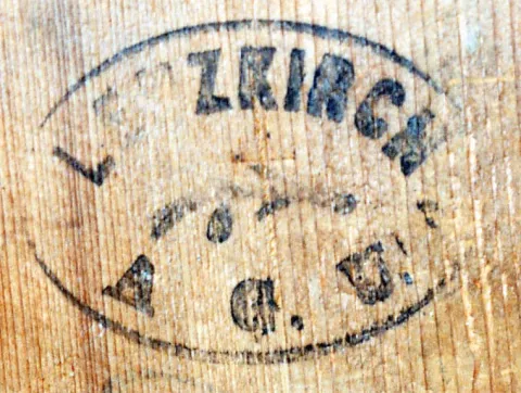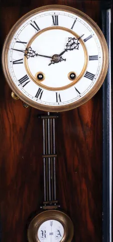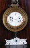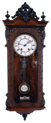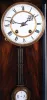 Lenzkirch Clock Co., Germany, miniature Vienna regulator, 8 days, time and strike, spring driven movement marked Lenzkirch in a walnut case also stamped Lenzkirch with burled veneer and brass pendulum with white enamel R/A insert, serial #317557. the case retains an old finish with some nicks and scuffs. One of the upper finials is a replacement. The mainspring on the strike side is broken. The enamel dial, beat scale and the pendulum are in excellent condition. The clock is a fine example.