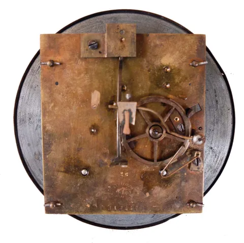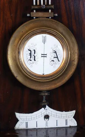 the case retains an old finish with some nicks and scuffs. One of the upper finials is a replacement. The mainspring on the strike side is broken. The enamel dial, beat scale and the pendulum are in excellent condition. The clock is a fine example.