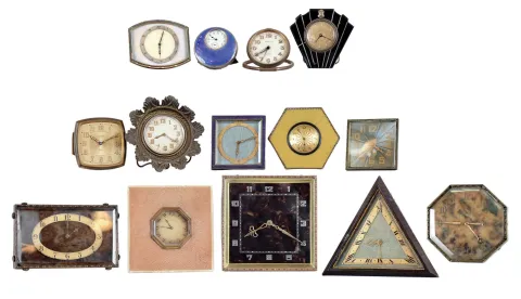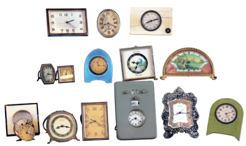 Clocks- 28 (Twenty-eight) European "strut" small metal case desk clocks, some 8 day, some with colorful enamel, nearly all antique and vintage. Makers include Waltham (German made) , Normis, Cyma for Gorham, J.E. Caldwell, Tiffany, and many unsigned