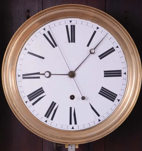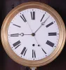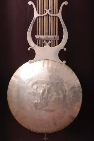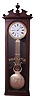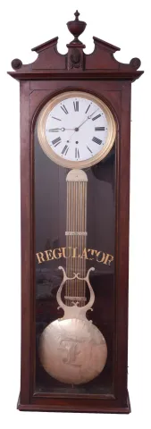 Jeweler's regulator wall clock, 8 day, time only, brass weight driven movement with pinwheel escapement and compensated lyre gridiron pendulum in a mahogany case with white enamel dial. the clock retains its original finish including front glass with gold leafed "REGULATOR" on door. The bottom is absent. The top finial is missing its tip. The door has its hinges reversed. Pendulum marked Fremeau [this is the clock referred to in the dedication story about John Fletcher]